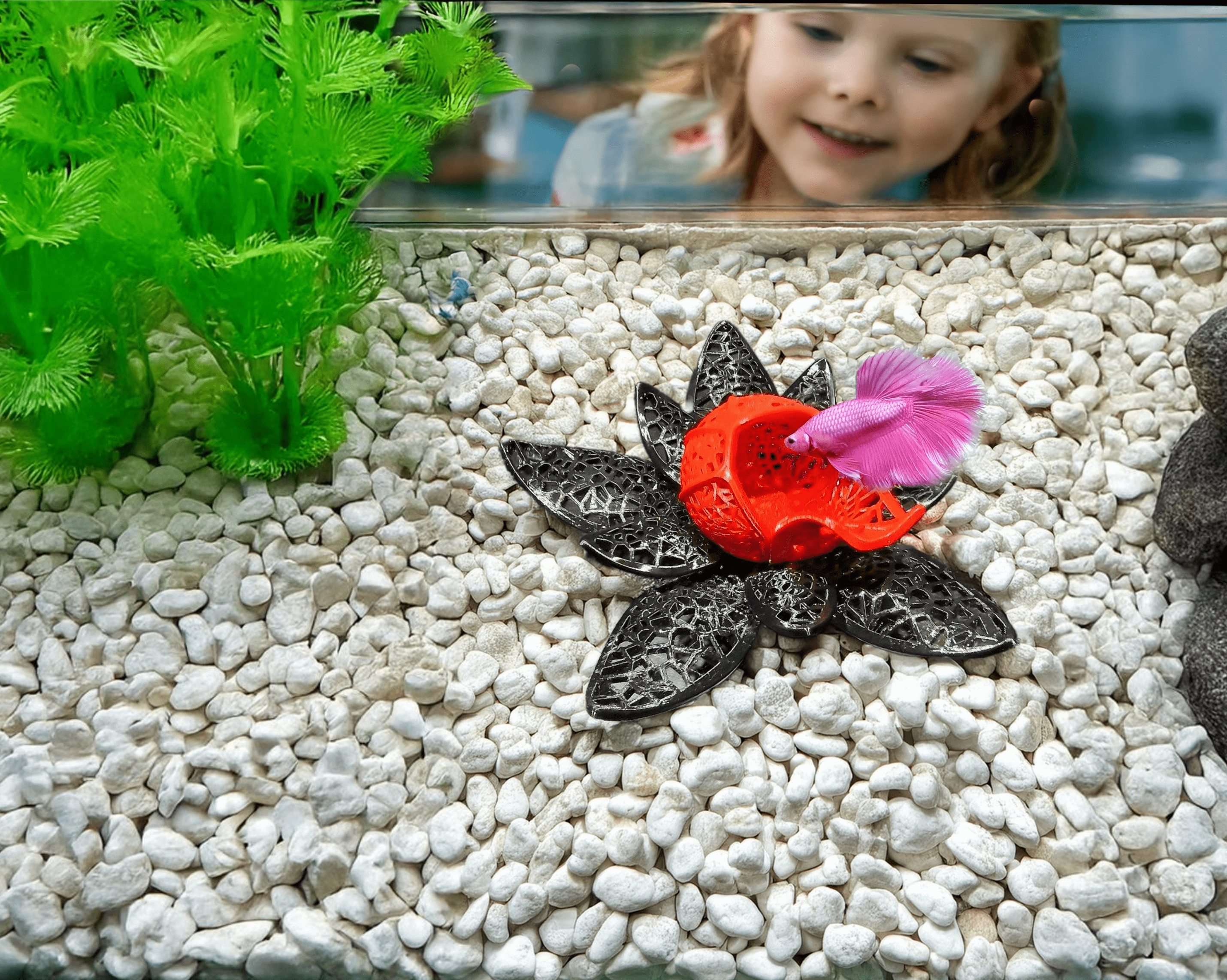 Custom 3D print in action - betta cave inspired by flower design. A pink betta fish is exploring the cave while a small girl observes the fish playing with the 3d print.